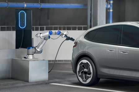 A robot automatically plugs in and unplugs the power cable. Once the vehicle’s battery is fully charged, the car drives away automatically, making way for the next one.